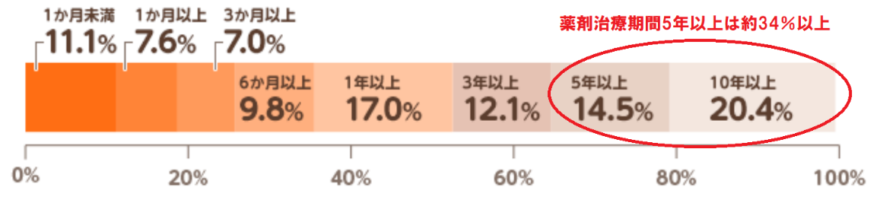 では薬剤治療期間はどのくらいでしょうか? 症状によっての違いがありますが、メディケア生命の上記アンケート結果によると、治療期間が5年以上かかる割合が34%超える結果が読み取れます。